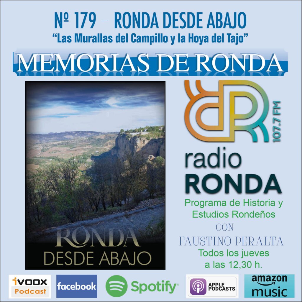 Seguimos con la Hoya o Caldera del Tajo. Nada más comenzar a bajar por la Cuesta del Campillo y de los Molinos, se nos presenta en todo su recorrido una panorámica impresionante de la Hoya o Caldera del Tajo: a la izquierda, la mole del Jarastepar y las estribaciones montañosas de Grazalema, Montejaque y Benaoján; a la derecha, el farallón rocoso –que sostiene la antigua medina rondeña (La Ciudad)– y la Garganta del Tajo y el Puente Nuevo; en frente, el enorme paredón rocoso donde se asienta la parte moderna de Ronda (El Mercadillo) y al centro, abajo, el valle del Guadalevín, que se abre a la enorme depresión del Tajo.